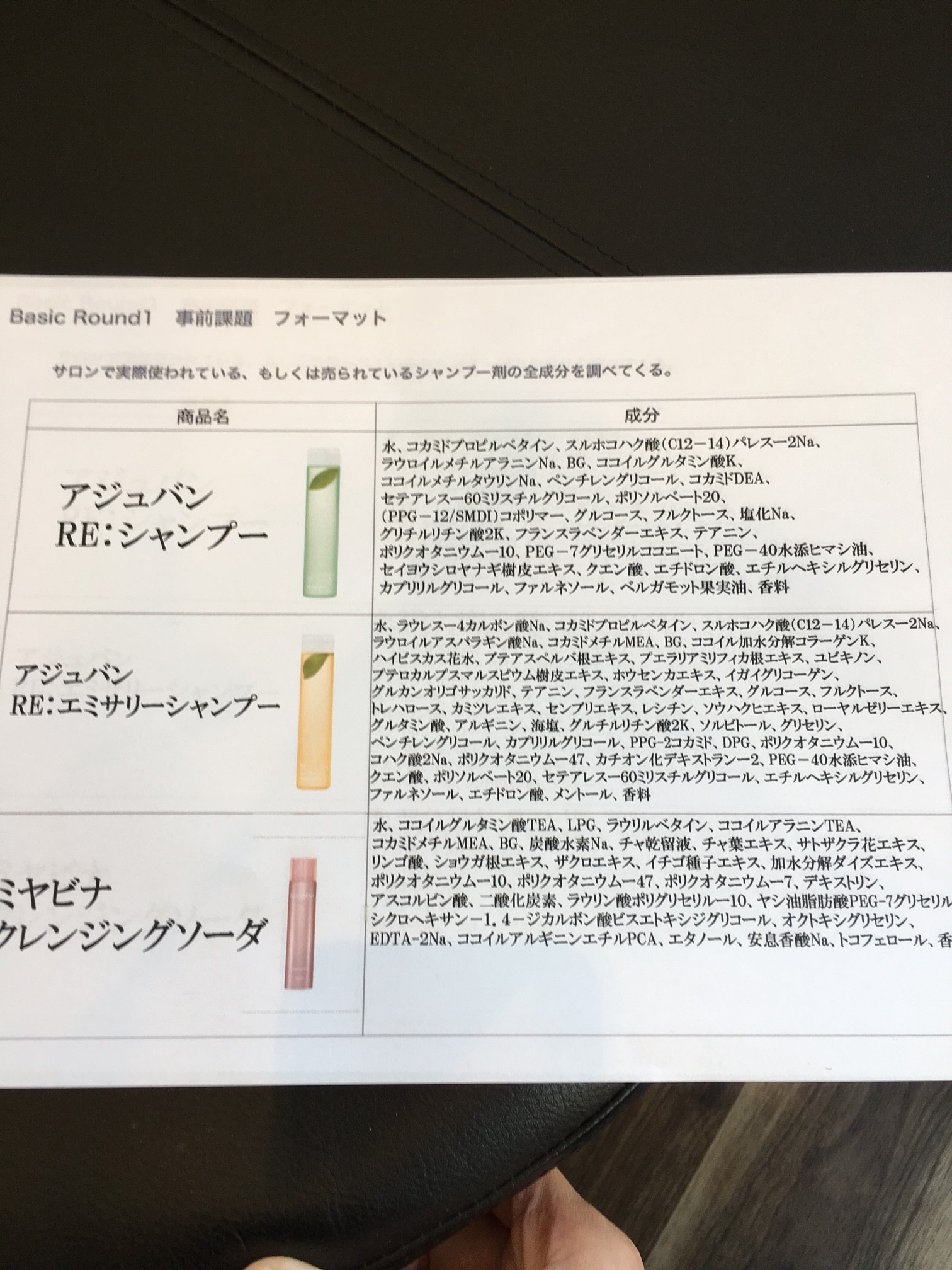 「お店で使っている主力シャンプーと、お客様が家でよく使っている市販のシャンプーの全成分を書き出してください」